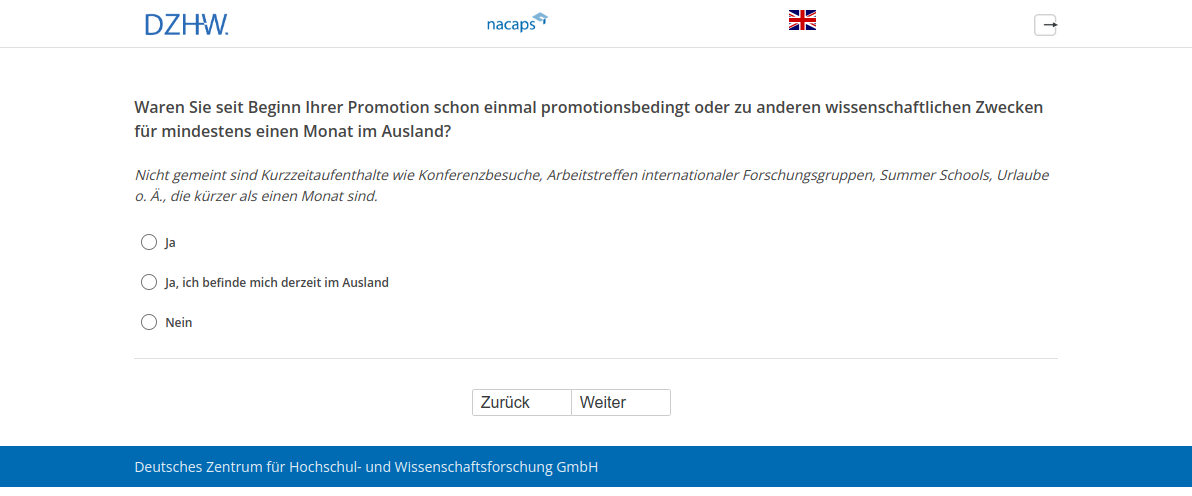 Nicht gemeint sind Kurzzeitaufenthalte wie Konferenzbesuche, Arbeitstreffen internationaler Forschungsgruppen, Summer Schools, Urlaube o. Ä., die kürzer als einen Monat sind.