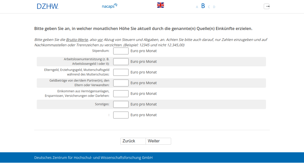 Bitte geben Sie die Brutto-Werte, also vor Abzug von Steuern und Abgaben, an. Achten Sie bitte auch darauf, nur Zahlen einzugeben und auf Nachkommastellen oder Trennzeichen zu verzichten. (Beispiel: 12345 und nicht 12.345,00)