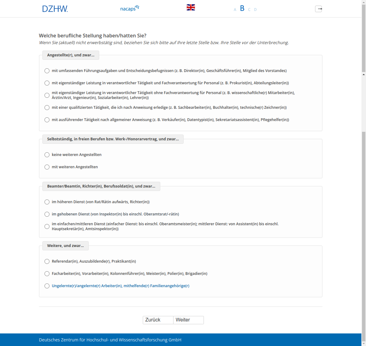 Wenn Sie (aktuell) nicht erwerbstätig sind, beziehen Sie sich bitte auf Ihre letzte Stelle bzw. Ihre Stelle vor der Unterbrechung.