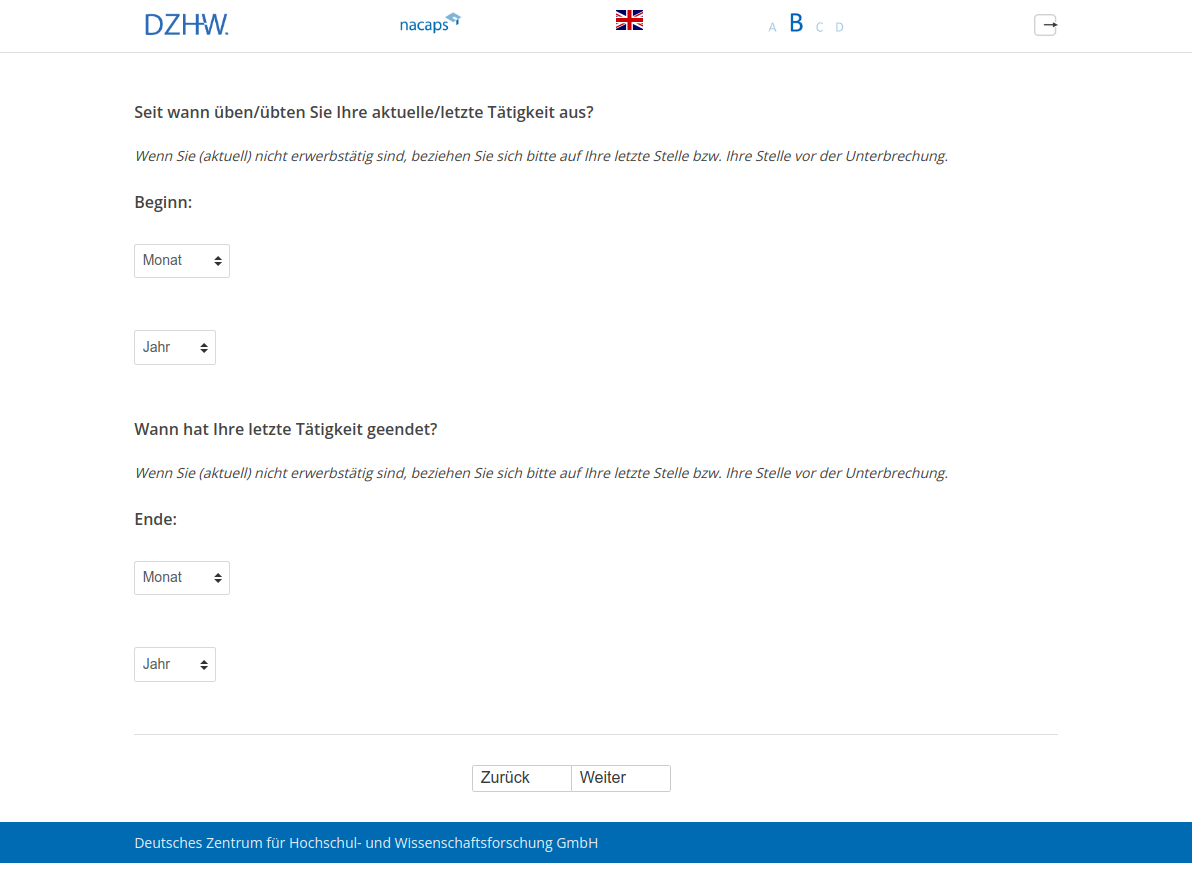 Wenn Sie (aktuell) nicht erwerbstätig sind, beziehen Sie sich bitte auf Ihre letzte Stelle bzw. Ihre Stelle vor der Unterbrechung.