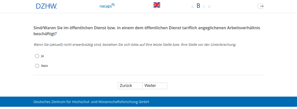 Wenn Sie (aktuell) nicht erwerbstätig sind, beziehen Sie sich bitte auf Ihre letzte Stelle bzw. Ihre Stelle vor der Unterbrechung.