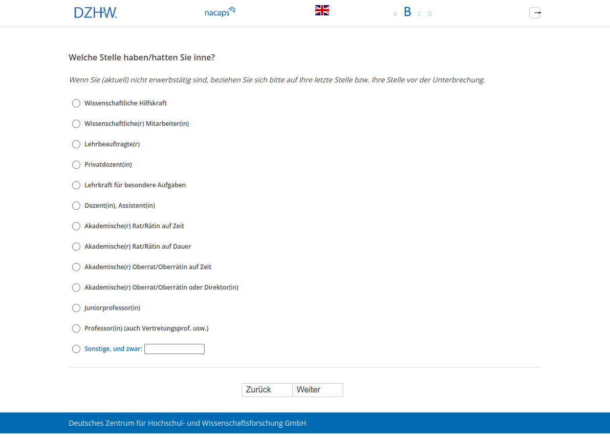 Wenn Sie (aktuell) nicht erwerbstätig sind, beziehen Sie sich bitte auf Ihre letzte Stelle bzw. Ihre Stelle vor der Unterbrechung.