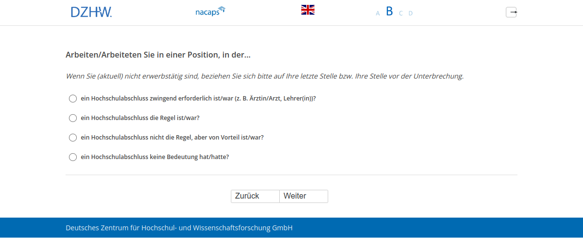 Wenn Sie (aktuell) nicht erwerbstätig sind, beziehen Sie sich bitte auf Ihre letzte Stelle bzw. Ihre Stelle vor der Unterbrechung.