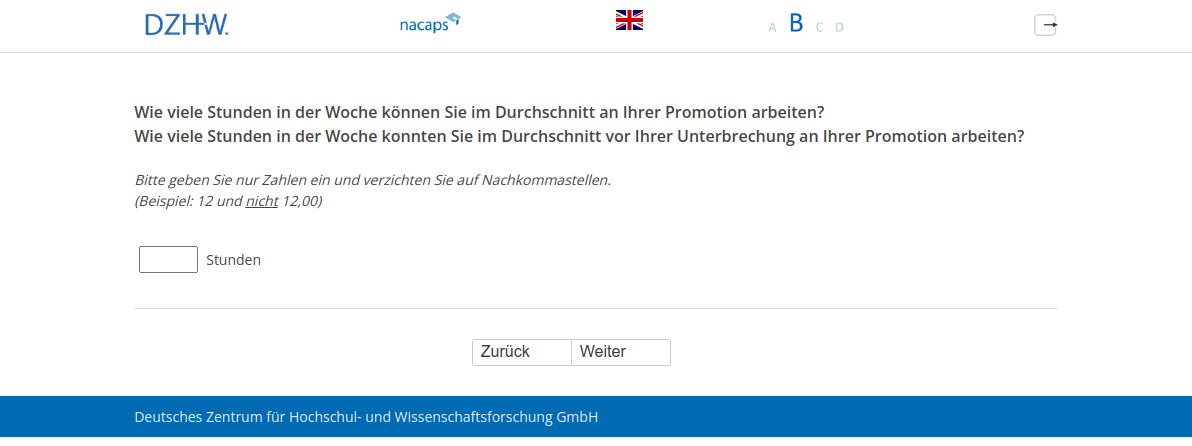 Wie viele Stunden in der Woche können Sie im Durchschnitt an Ihrer Promotion arbeiten?,Wie viele Stunden in der Woche konnten Sie im Durchschnitt vor Ihrer Unterbrechung an Ihrer Promotion arbeiten?
