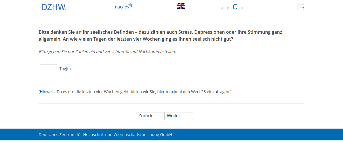 Bitte denken Sie an Ihr seelisches Befinden – dazu zählen auch Stress, Depressionen oder Ihre Stimmung ganz allgemein. An wie vielen Tagen der letzten vier Wochen ging es Ihnen seelisch nicht gut?