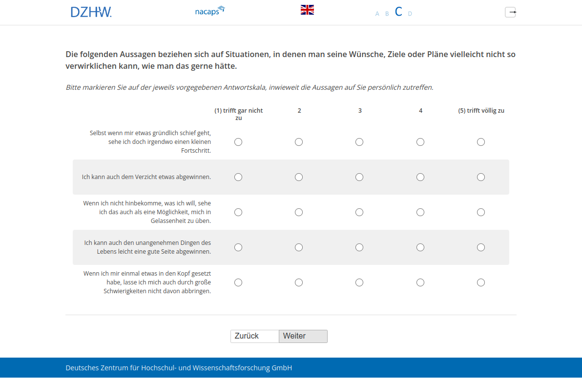 Die folgenden Aussagen beziehen sich auf Situationen, in denen man seine Wünsche, Ziele oder Pläne vielleicht nicht so verwirklichen kann, wie man das gerne hätte.