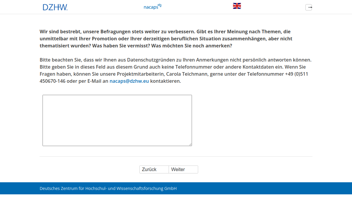 Wir sind bestrebt, unsere Befragungen stets weiter zu verbessern. Gibt es Ihrer Meinung nach Themen, die unmittelbar mit Ihrer Promotion oder Ihrer derzeitigen beruflichen Situation zusammenhängen, aber nicht thematisiert wurden? Was haben Sie vermisst? Was möchten Sie noch anmerken? Bitte beachten Sie, dass wir Ihnen aus Datenschutzgründen zu Ihren Anmerkungen nicht persönlich antworten können. Bitte geben Sie in dieses Feld aus diesem Grund auch keine Telefonnummer oder andere Kontaktdaten ein. Wenn Sie Fragen haben, können Sie unsere Projektmitarbeiterin, Carola Teichmann, gerne unter der Telefonnummer +49 (0)511 450670-146 oder per E-Mail an nacaps@dzhw.eu kontaktieren.