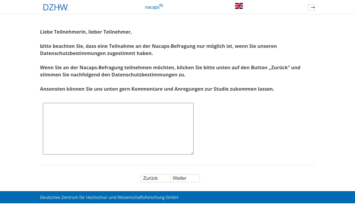 Liebe Teilnehmerin, lieber Teilnehmer, bitte beachten Sie, dass eine Teilnahme an der Nacaps-Befragung nur möglich ist, wenn Sie unseren Datenschutzbestimmungen zugestimmt haben. Wenn Sie an der Nacaps-Befragung teilnehmen möchten, klicken Sie bitte unten auf den Button „Zurück“ und stimmen Sie nachfolgend den Datenschutzbestimmungen zu. Ansonsten können Sie uns unten gern Kommentare und Anregungen zur Studie zukommen lassen.