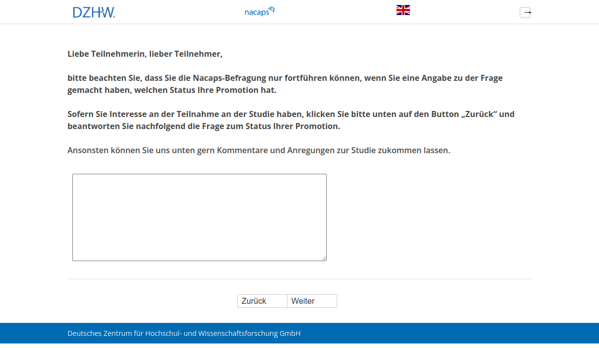 Liebe Teilnehmerin, lieber Teilnehmer, bitte beachten Sie, dass Sie die Nacaps-Befragung nur fortführen können, wenn Sie eine Angabe zu der Frage gemacht haben, welchen Status Ihre Promotion hat. Sofern Sie Interesse an der Teilnahme an der Studie haben, klicken Sie bitte unten auf den Button „Zurück“ und beantworten Sie nachfolgend die Frage zum Status Ihrer Promotion.,Ansonsten können Sie uns unten gern Kommentare und Anregungen zur Studie zukommen lassen.
