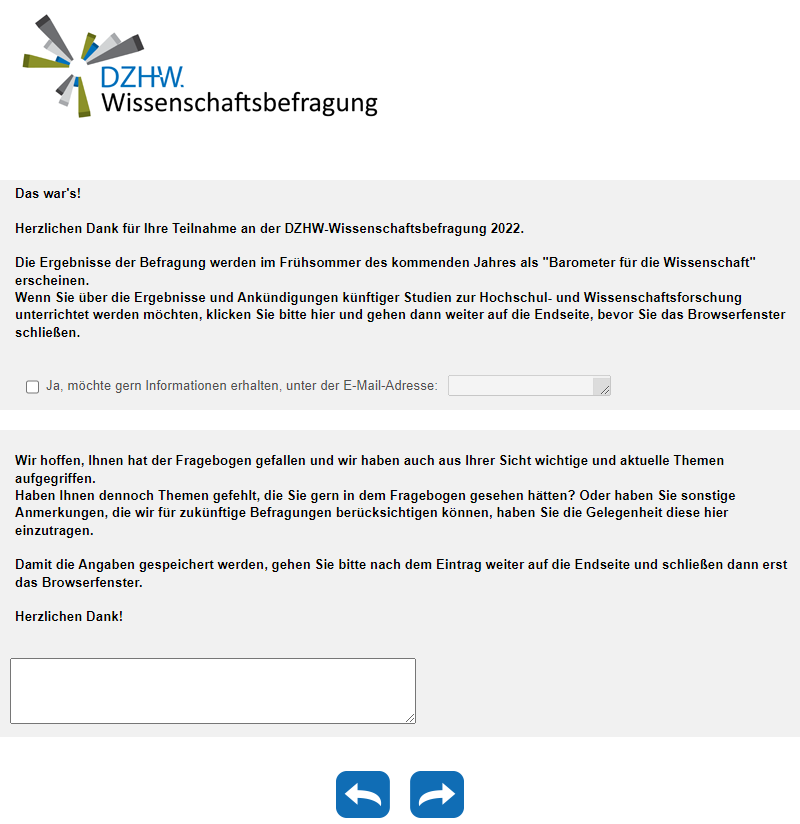 Das war's! Herzlichen Dank für Ihre Teilnahme an der DZHW-Wissenschaftsbefragung 2022. Die Ergebnisse der Befragung werden im Frühsommer des kommenden Jahres als "Barometer für die Wissenschaft" erscheinen.