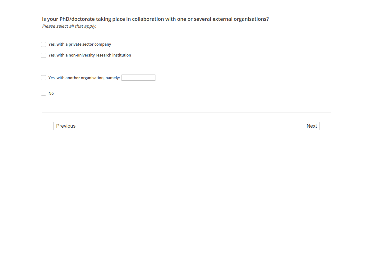 Is your PhD/doctorate taking place in collaboration with one or several external organisations?