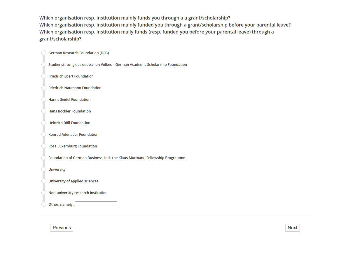 Which organisation resp. institution mainly funds you through a a grant/scholarship?/Which organisation resp. institution mainly funded you through a grant/scholarship before your parental leave?/Which organisation resp. institution maily funds (resp. funded you before your parental leave) through a grant/scholarship?