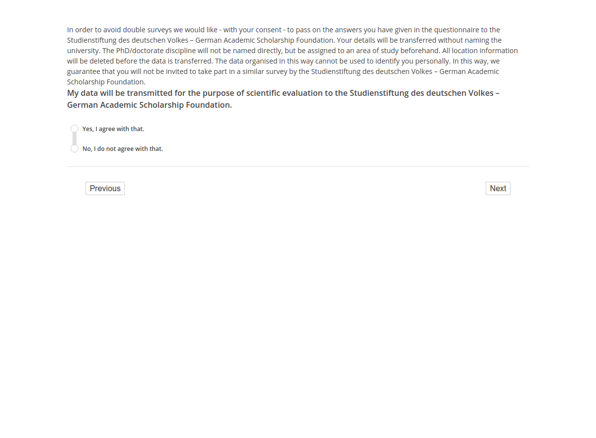 In order to avoid double surveys we would like - with your consent - to pass on the answers you have given in the questionnaire to the Studienstiftung des deutschen Volkes – German Academic Scholarship Foundation. Your details will be transferred without naming the university. The PhD/doctorate discipline will not be named directly, but be assigned to an area of study beforehand. All location information will be deleted before the data is transferred. The data organised in this way cannot be used to identify you personally. In this way, we guarantee that you will not be invited to take part in a similar survey by the Studienstiftung des deutschen Volkes – German Academic Scholarship Foundation.