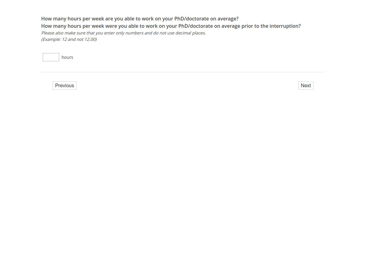How many hours per week are you able to work on your PhD/doctorate on average?/How many hours per week were you able to work on your PhD/doctorate on average prior to the interruption?