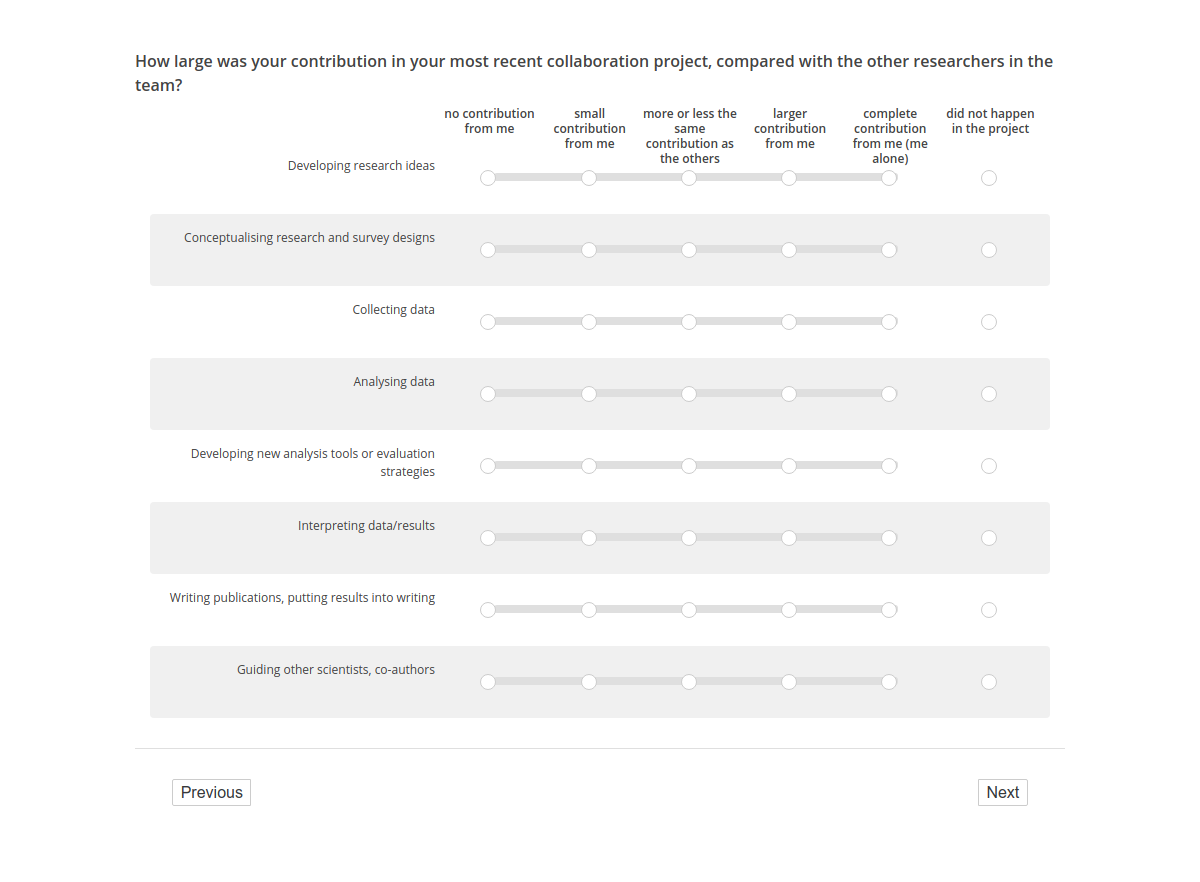 How large was your contribution in your most recent collaboration project, compared with the other researchers in the team?