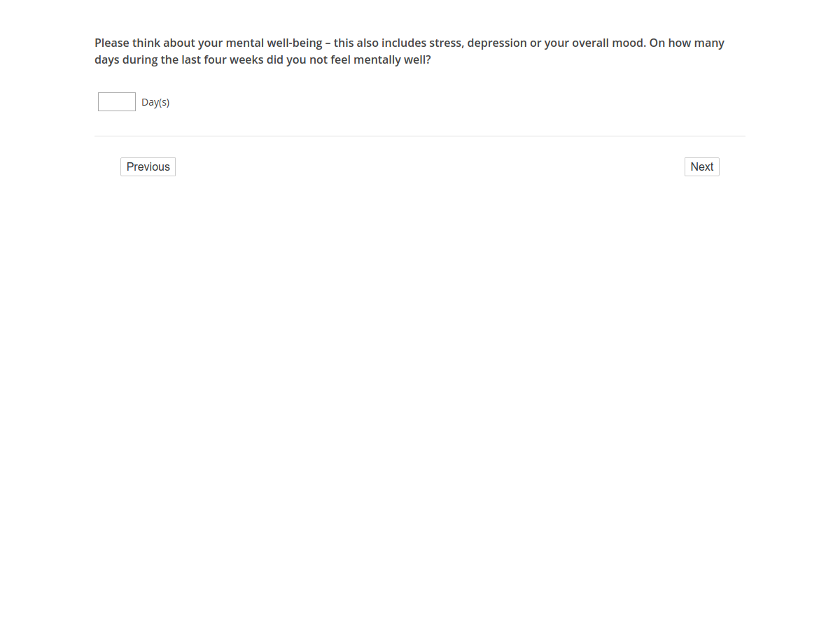 Please think about your mental well-being – this also includes stress, depression or your overall mood. On how many days during the last four weeks did you not feel mentally well?