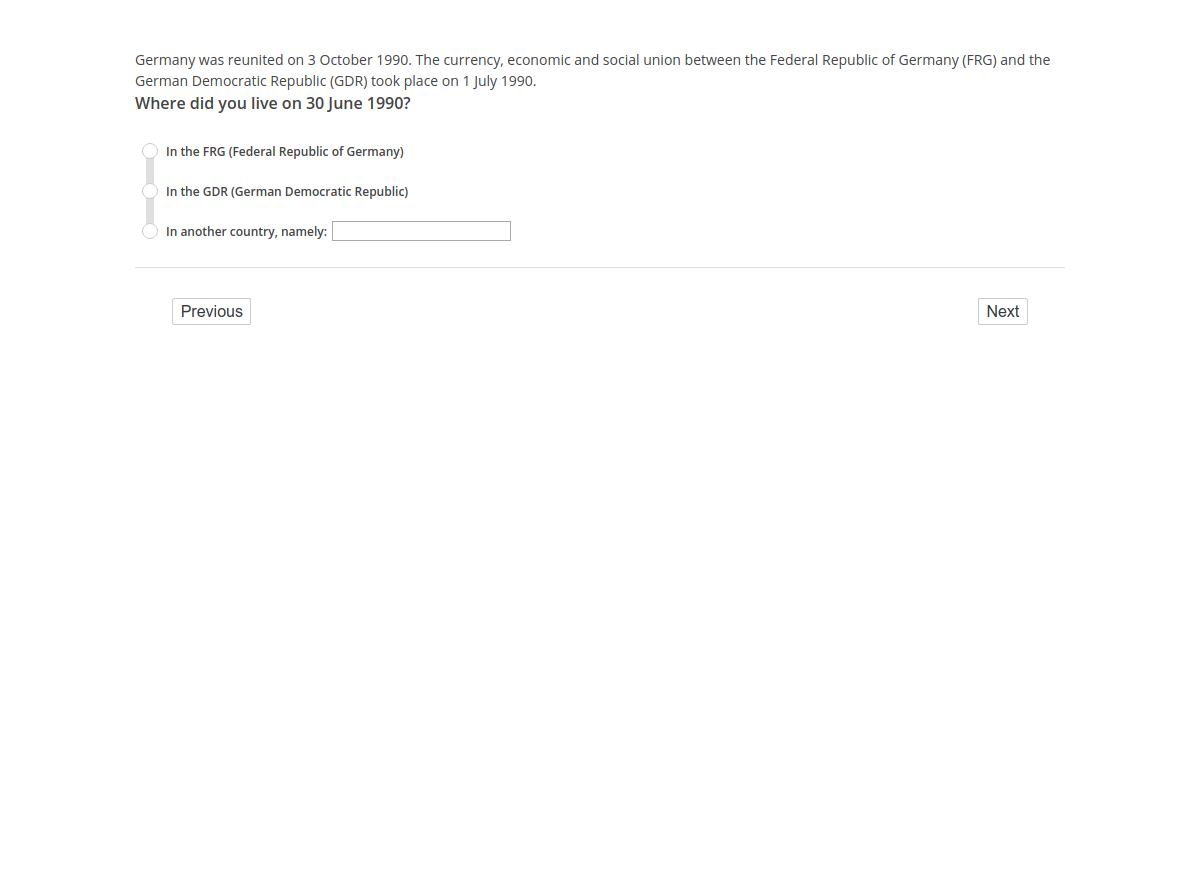 Germany was reunited on 3 October 1990. The currency, economic and social union between the Federal Republic of Germany (FRG) and the German Democratic Republic (GDR) took place on 1 July 1990.