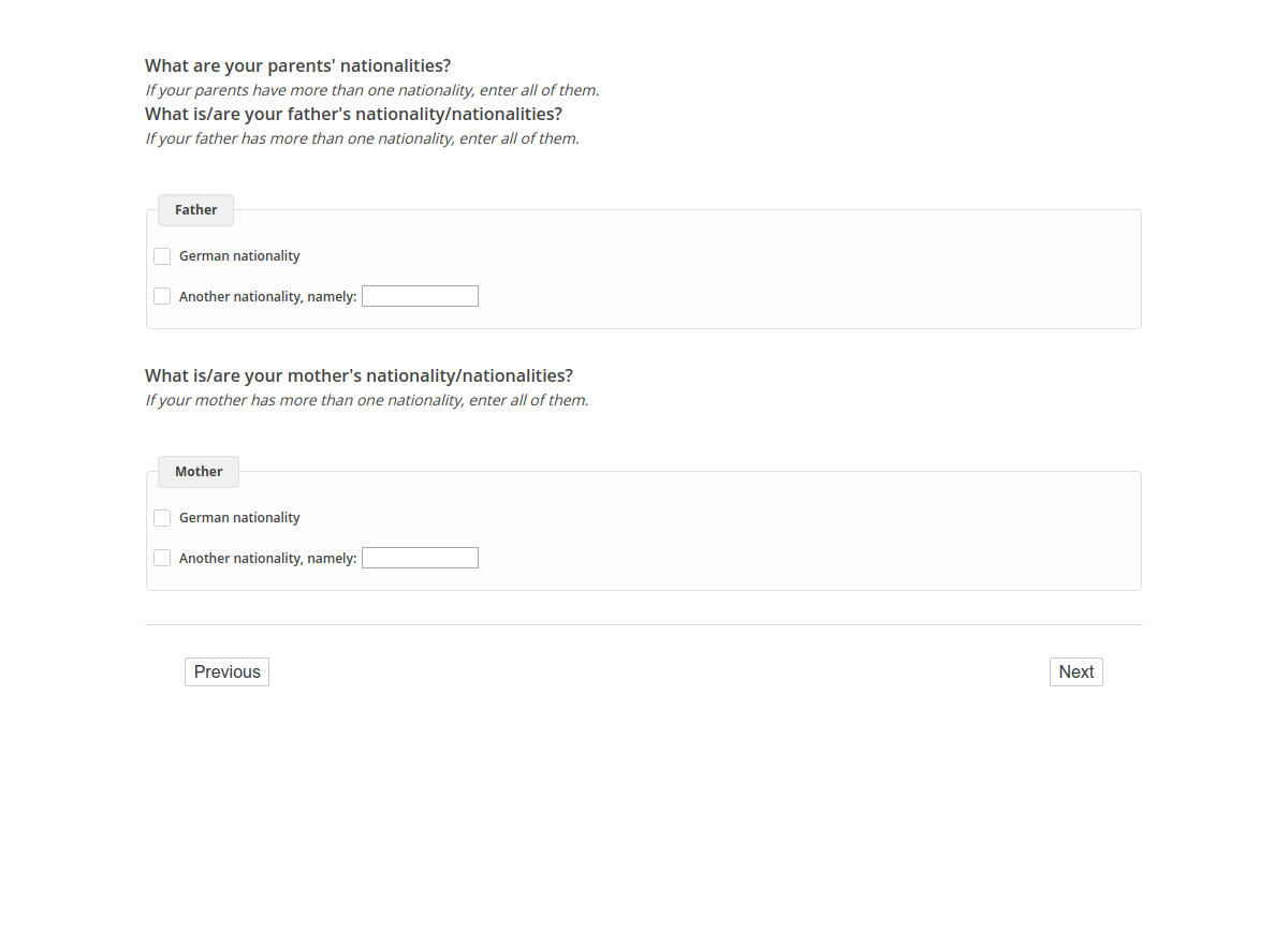 If your parents have more than one nationality, enter all of them./If your father has more than one nationality, enter all of them./If your mother has more than one nationality, enter all of them.