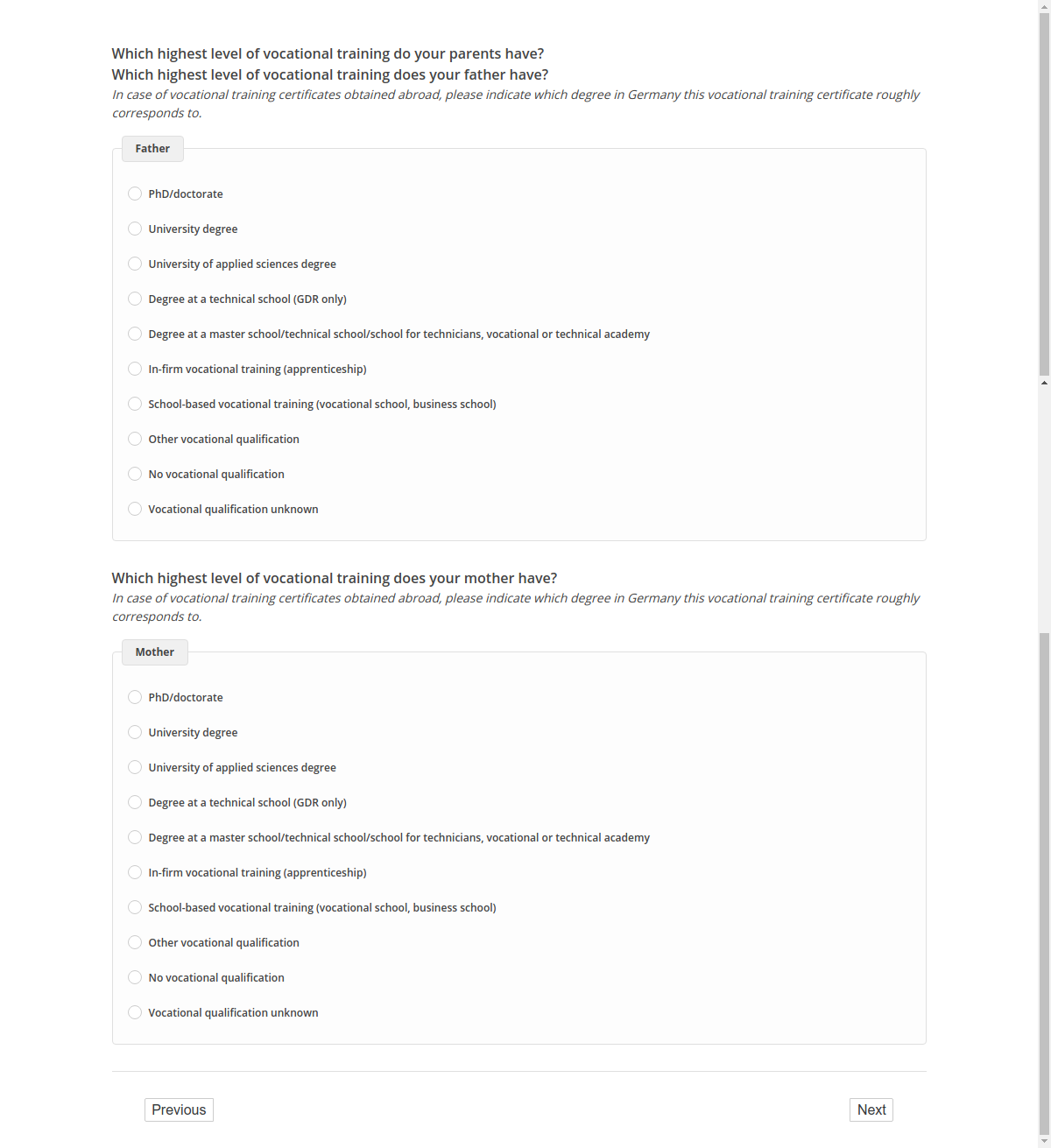 Which highest level of vocational training do your parents have?/Which highest level of vocational training does your father have?/Which highest level of vocational training does your mother have?