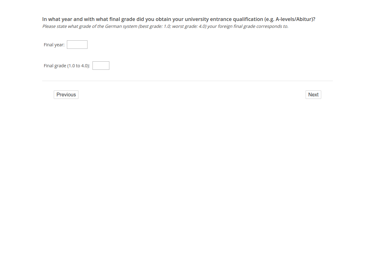 In what year and with what final grade did you obtain your university entrance qualification (e.g. A-levels/Abitur)?