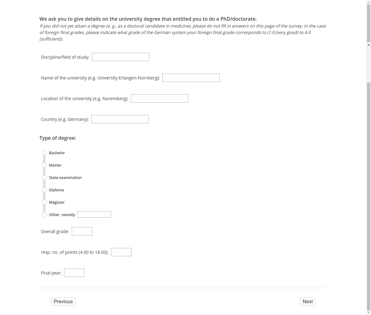 If you did not yet attain a degree (e. g., as a doctoral candidate in medicine), please do not fill in answers on this page of the survey. In the case of foreign final grades, please indicate what grade of the German system your foreign final grade corresponds to (1.0 (very good) to 4.0 (sufficient)).