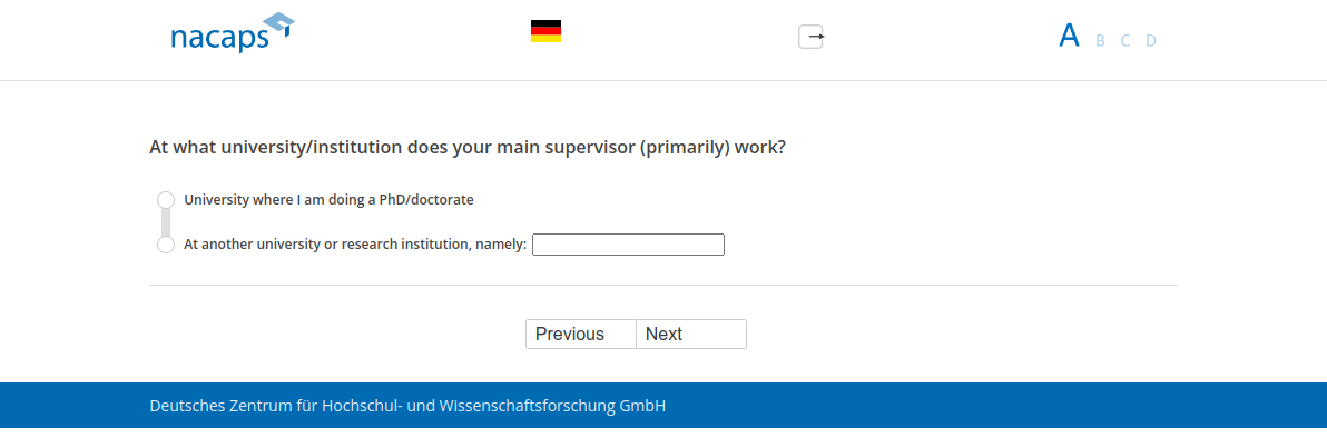 In the last survey, about a year ago, you gave the following information regarding the main supervisor of your PhD/doctorate: Did something change in the meantime?,In the last survey, about a year ago, you have not provided any information regarding the main supervisor of your PhD/doctorate, (yet). We therefore ask you some questions about this person.,In the last survey, about a year ago, you have already provided some information regarding the main supervisor of your PhD/doctorate. As a lot can change within one year, we would like to ask you some questions about this person again.