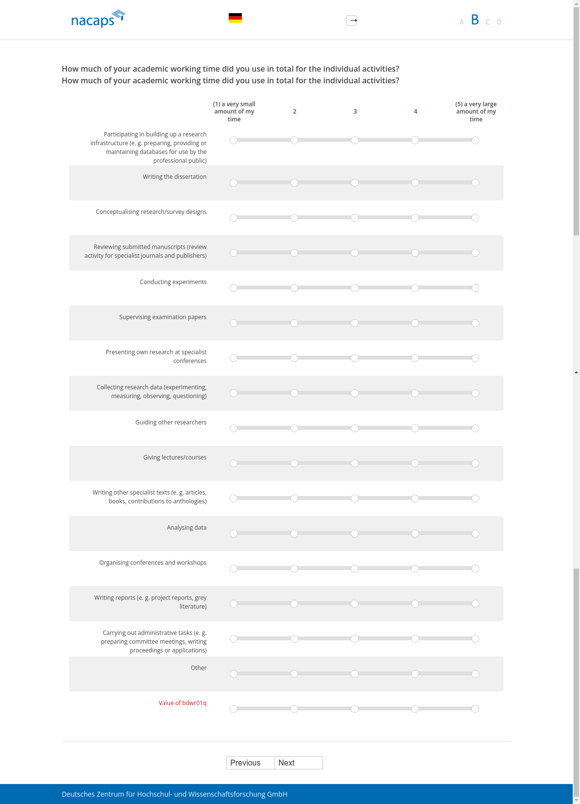 Which of the following activities do you carry out in your current day-to-day work?,Which of the following activities did you carry out since the last survey as part of your PhD/doctorate or another part of your academic day-to-day work?