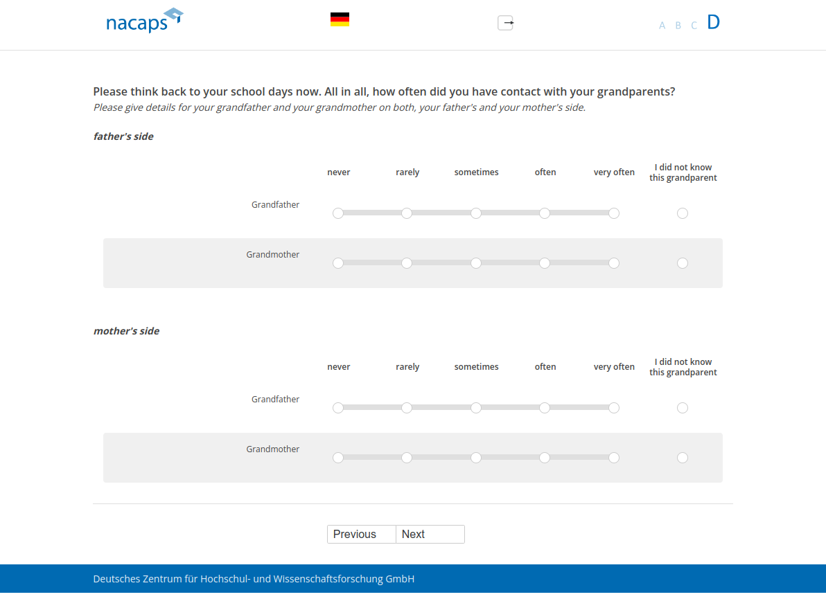 For the success of Nacaps it is of particular importance that we may question you again. Nacaps is designed as a longitudinal study in order to analyse the progress of PhDs/doctorates and career paths over a longer period of time. Therefore, we would like to ask you once again to allow us to contact you again in about one year.,If you would like to participate in the further survey or in the raffle, please click on the Link.