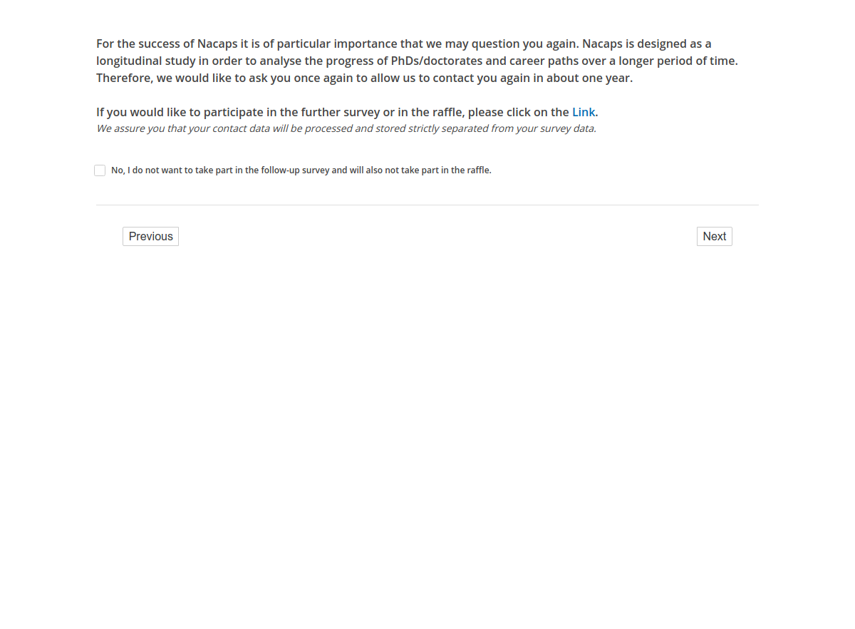 For the success of Nacaps it is of particular importance that we may question you again. Nacaps is designed as a longitudinal study in order to analyse the progress of PhDs/doctorates and career paths over a longer period of time. Therefore, we would like to ask you once again to allow us to contact you again in about one year.,If you would like to participate in the further survey or in the raffle, please click on the Link.