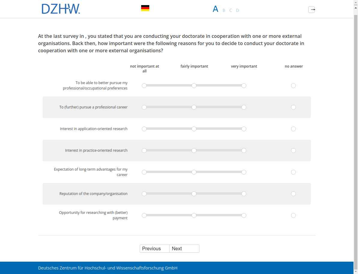At the last survey in #{PRELOADcpl008.value}, you stated that you are conducting your doctorate in cooperation with one or more external organisations. Back then, how important were the following reasons for you to decide to conduct your doctorate in cooperation with one or more external organisations?