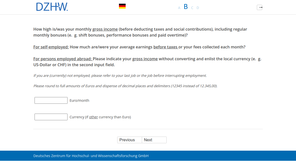 If you are (currently) not employed, please refer to your last job or the job before interrupting employment.,Please round to full amounts of Euros and dispense of decimal places and delimiters (12345 instead of 12.345,00).