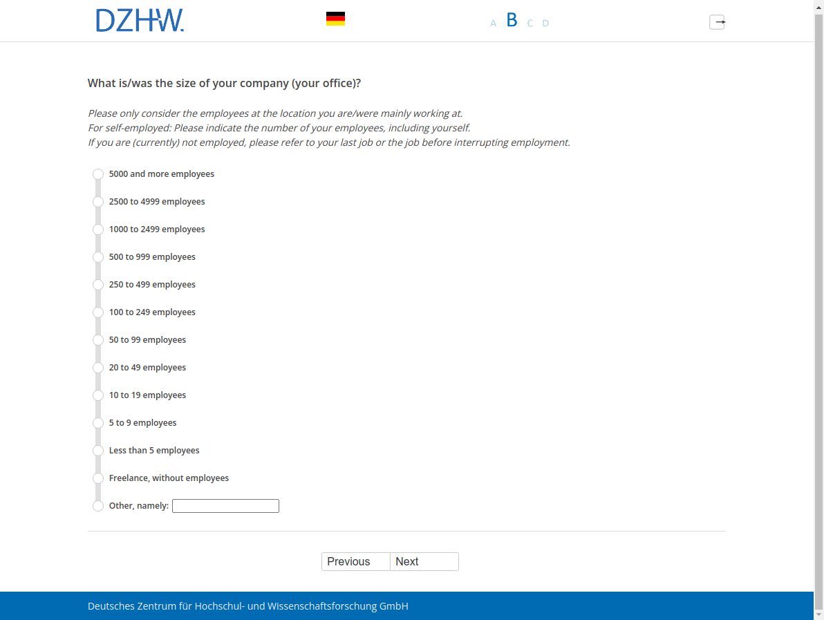 Please only consider the employees at the location you are/were mainly working at. For self-employed: Please indicate the number of your employees, including yourself. If you are (currently) not employed, please refer to your last job or the job before interrupting employment.