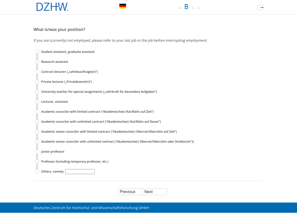 If you are (currently) not employed, please refer to your last job or the job before interrupting employment.