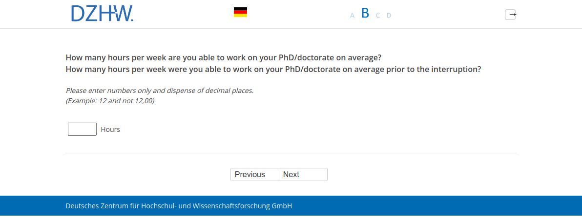 How many hours per week are you able to work on your PhD/doctorate on average?,How many hours per week were you able to work on your PhD/doctorate on average prior to the interruption?