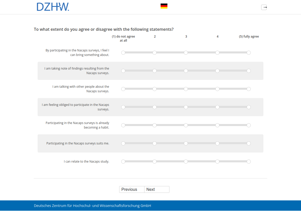 Your participation is voluntary, of course. Your information will be used for research and evaluation purposes. All Nacaps data will be published and made available to other scientists anonymously only. Your contact details will always be processed and stored separately from the survey data. Under no circumstances will your contact information be shared with third parties.