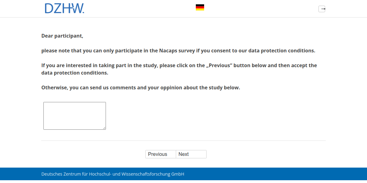 Dear participant,please note that you can only participate in the Nacaps survey if you consent to our data protection conditions. If you are interested in taking part in the study, please click on the „Previous“ button below and then accept the data protection conditions. Otherwise, you can send us comments and your oppinion about the study below.