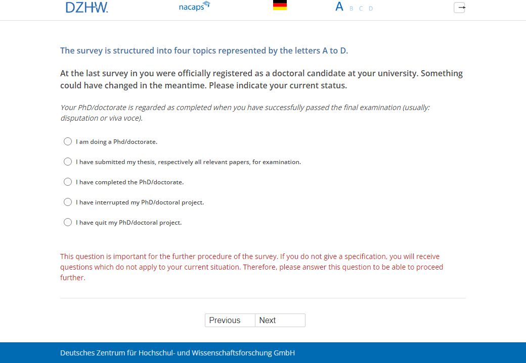 Dear participant, please note that you can only continue with the Nacaps survey if you answered the question regarding the status of your PhD/doctorate. If you are interested in taking part in the study, please click on the „Previous“ button below and answer the question on the status of your PhD/doctorate.,Otherwise, you can send us comments and your opinions about the study below.