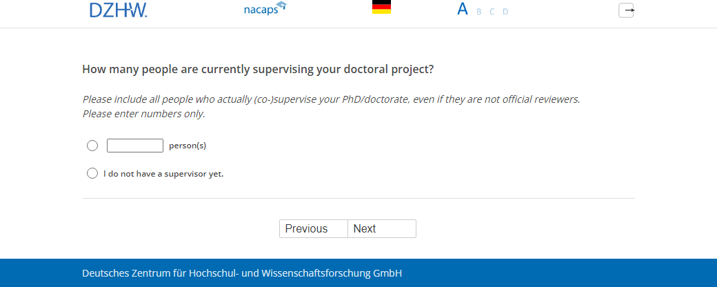 Please include all people who actually (co-)supervise your PhD/doctorate, even if they are not official reviewers.,Please enter numbers only.