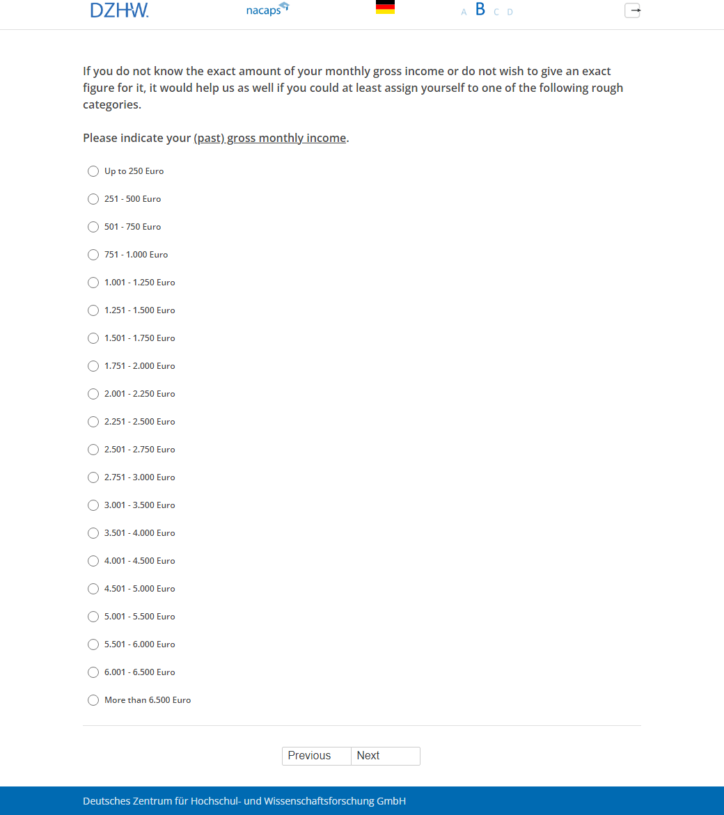 If you do not know the exact amount of your monthly gross income or do not wish to give an exact figure for it, it would help us as well if you could at least assign yourself to one of the following rough categories. Please indicate your (past) gross monthly income.