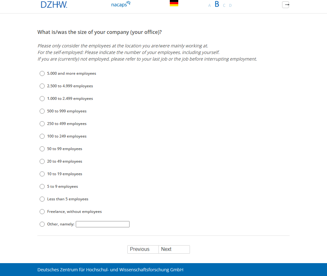 Please only consider the employees at the location you are/were mainly working at. For the self-employed: Please indicate the number of your employees, including yourself. If you are (currently) not employed, please refer to your last job or the job before interrupting employment.