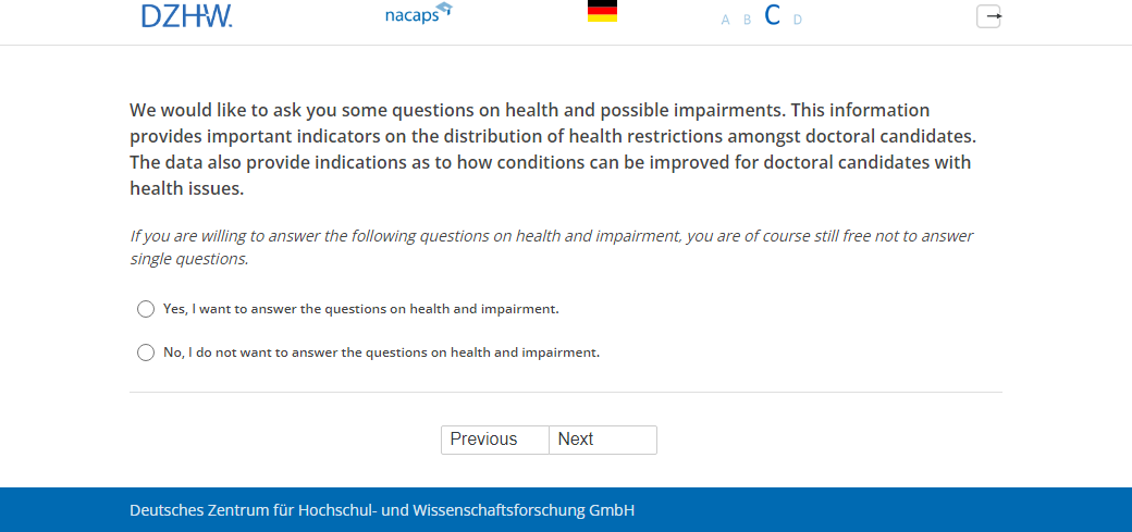 If you are willing to answer the following questions on health and impairment, you are of course still free not to answer single questions.
