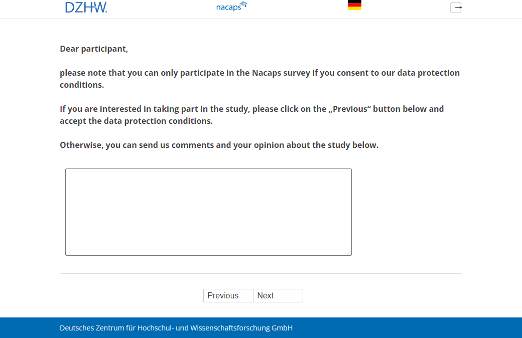 Dear participant, please note that you can only participate in the Nacaps survey if you consent to our data protection conditions. If you are interested in taking part in the study, please click on the „Previous“ button below and accept the data protection conditions. Otherwise, you can send us comments and your opinion about the study below.