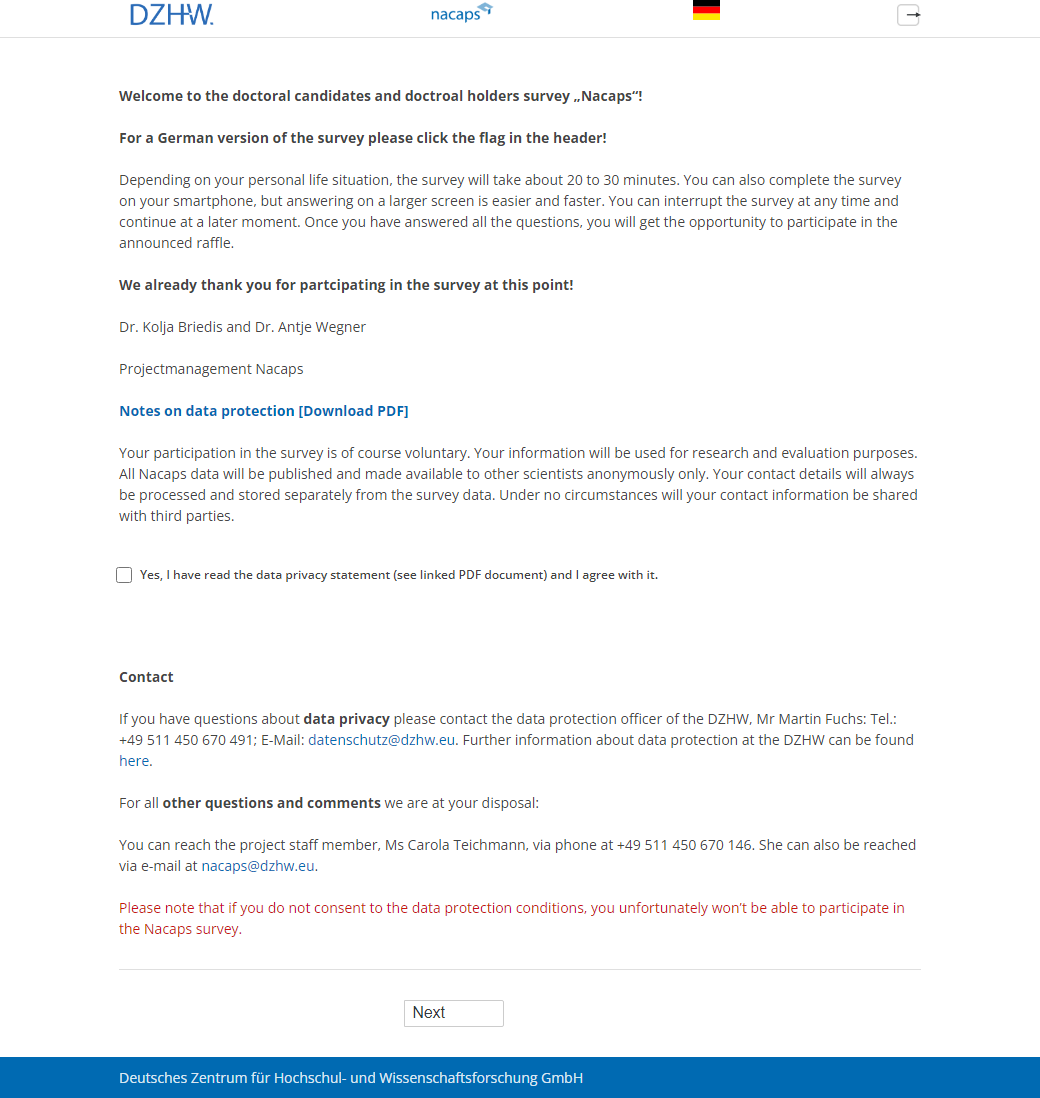 Your participation in the survey is of course voluntary. Your information will be used for research and evaluation purposes. All Nacaps data will be published and made available to other scientists anonymously only. Your contact details will always be processed and stored separately from the survey data. Under no circumstances will your contact information be shared with third parties.